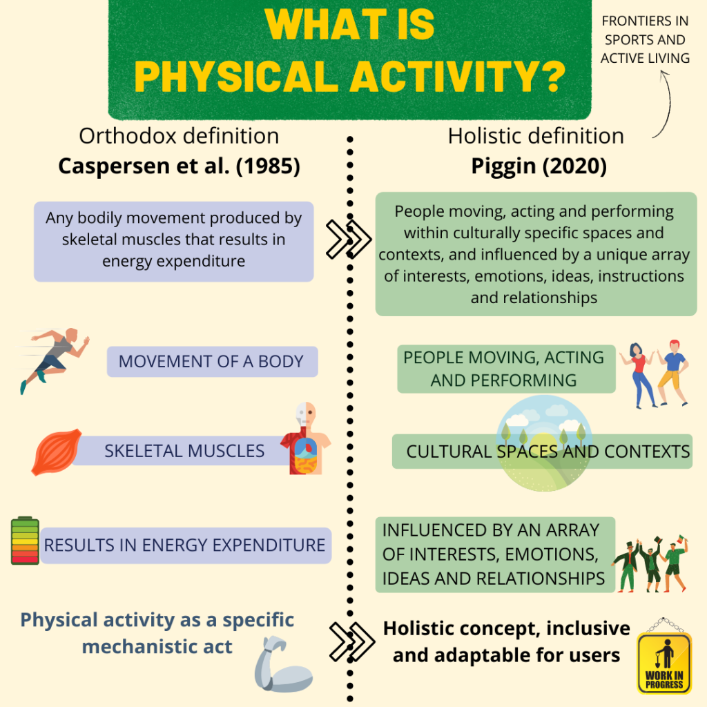 Esimese asjana defineeriks liikumise ehk kehalise aktiivsuse, mis on laiem mõiste kui sport või treening: “Kehaline aktiivsus on inimeste liikumine, tegutsemine ja esinemine erinevates kultuurilistes ruumides ja kontekstides. Seda mõjutavad erinevad huvid, emotsioonid, ideed, juhised ja suhted.” Eee, mida? Iva on selles, et kehaline aktiivsus on ka aia- või kodutööd, matkamine, lastega müramine, peol tantsimine, raskete kohvrite tassimine, kõnnikoosolek jpm.